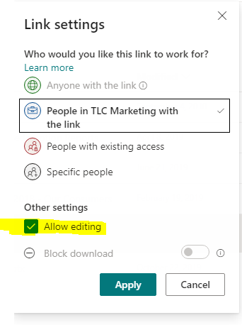 Pn1995Brass ContributorSep 08, 2020Change Default Sharing Option to Read When sharing files with people outside our organisation, is it possible to have the “allow editing” function turned off as default? Show More