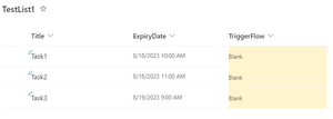 Hi! I've a list with colum ExpiryDate and column TriggerFlow. When the fields in column TriggerFlow change, my Power Automate flow runs. So, I'd like to change value in the column fields Tr...