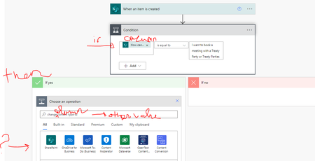 Hello 🙂 I created 5 content types. They are listed in a column. When a new item is created: IF the value of the column “how can we help you” is equal to “ I want to book a meeting” THEN chan...