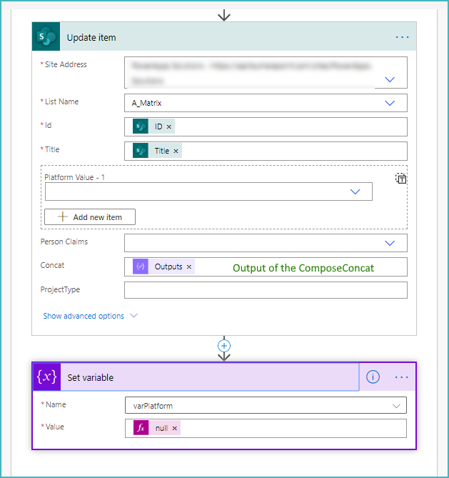 jawilson you can do this with a flow in Power Automate and you DO need the Apply to each control as each answer of your multi-choice column needs to be evaluated. In the list below the Platform column is a Choice column with multiple selections allowed, Person is a Person column and Concat is a single line of text column. The result is: