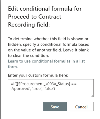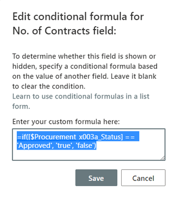 I want to add the following conditional formula =if([$Procurement_x003a_Status] == 'Approved', 'true', 'false') to a yes/no column in my SharePoint List Form, but for some reason it is not allowing me to save the formula. This conditional formula is being used on my choice columns without any problems.