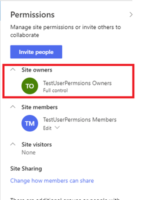 We have a Modern Team site named "TesUserPermision" and i am confused on who is defined as the site owner. First step >> i went to Site Permission >> i got that the "TestUserPermision Owners" is in...