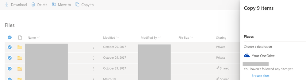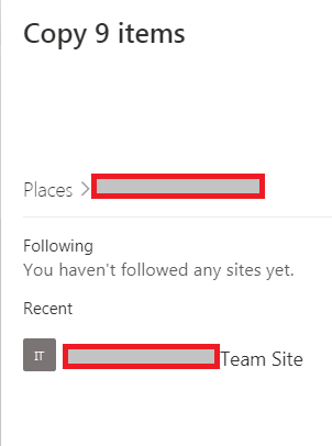 now we already have an empty modern team site created by the office 365 admin one year ago + i create a new modern team site today. but when i access the user's onedrive personal site >> select the folders >> click on "Copy To" >> i only got the root site collection to copy the files to... while i need to copy the files/folders to the newly create modern team site or to the previously created modern team site..
