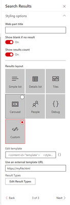 contentclass:STS_Site AND DepartmentId={<Hub site id>}You can edit your display template from web part settings or create a HandleBars template file and link it to web part.