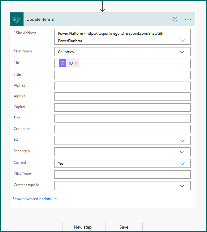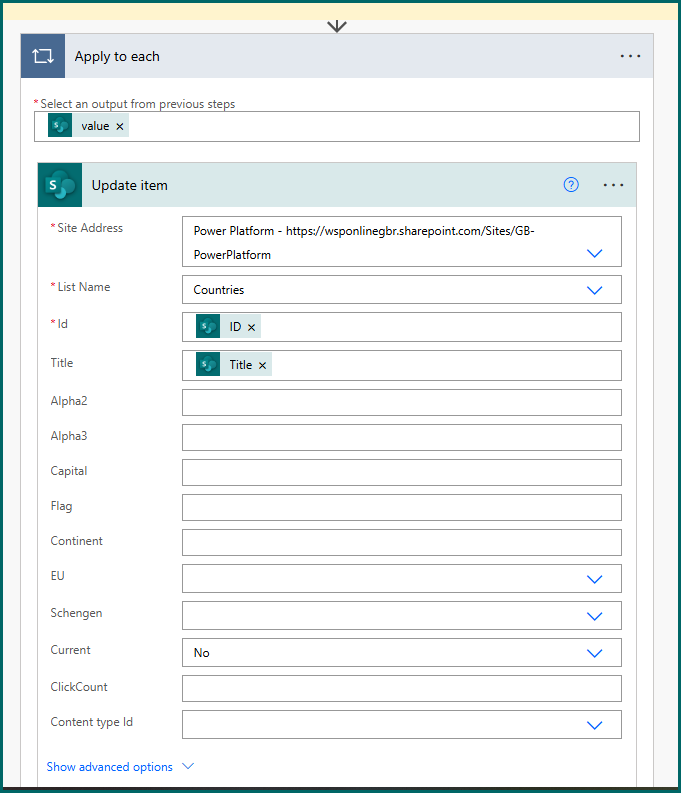 We then need to update the list again with the new current item. The ID is from the ID in the Parse JSON section of the dynamic content box and select Yes in the Current field.