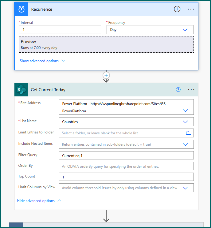 The flow is as follows. It runs once a day at 0700 and gets the item that is currently marked as Yes in the Current column: