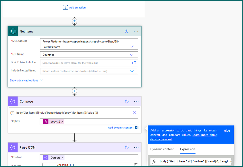 We then get all the items from the list and in a Compose action add the following expression to get a random item from the first item in the list, 0, to however many items there are in the list: