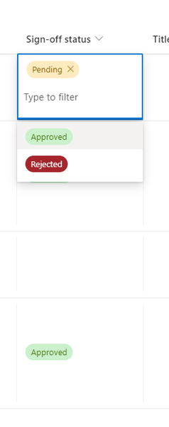 { "$schema": "https://developer.microsoft.com/json-schemas/sp/v2/column-formatting.schema.json", "elmType": "div", "inlineEditField": "@currentField", "style": { "flex-wrap": "wrap", "display": "flex" }, "children": [ { "elmType": "div", "style": { "box-sizing": "border-box", "padding": "4px 8px 5px 8px", "overflow": "hidden", "text-overflow": "ellipsis", "display": "flex", "border-radius": "16px", "height": "24px", "align-items": "center", "white-space": "nowrap", "margin": "4px 4px 4px 4px" }, "attributes": { "class": { "operator": ":", "operands": [ { "operator": "==", "operands": [ "@currentField", "Rejected" ] }, "sp-css-backgroundColor-BgDarkRed sp-css-borderColor-WhiteFont sp-field-fontSizeSmall sp-css-color-WhiteFont", { "operator": ":", "operands": [ { "operator": "==", "operands": [ "@currentField", "Approved" ] }, "sp-css-backgroundColor-BgMintGreen sp-field-fontSizeSmall sp-css-color-MintGreenFont", { "operator": ":", "operands": [ { "operator": "==", "operands": [ "@currentField", "Pending" ] }, "sp-css-backgroundColor-BgGold sp-field-fontSizeSmall sp-css-color-GoldFont", { "operator": ":", "operands": [ { "operator": "==", "operands": [ "@currentField", "" ] }, "", "sp-field-borderAllRegular sp-field-borderAllSolid sp-css-borderColor-neutralSecondary" ] } ] } ] } ] } }, "txtContent": "@currentField" } ] }Output: