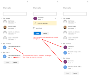 We are seeing some strange behavior on some of our Modern Communication sites. When adding a user or a group with Read or Edit rights via the share button on the top of the page, we are seeing duplic...