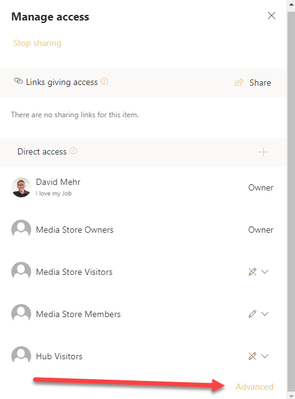 You see the sharing links and the direct access, you can also go to advanced for an classic permission overview vor your document: