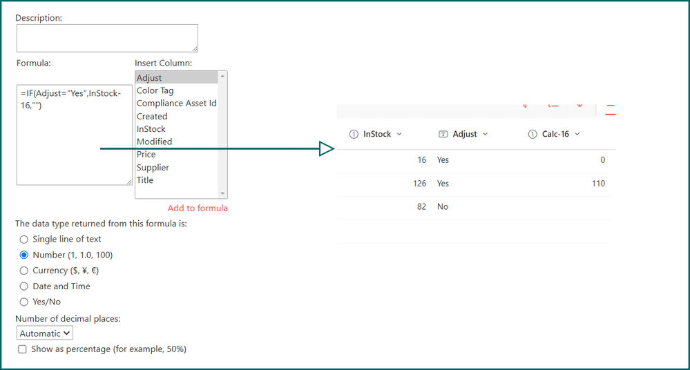 - If the value in Column A is equal to "Yes," the calculated column should take the value from Column B and subtract 16 from it.