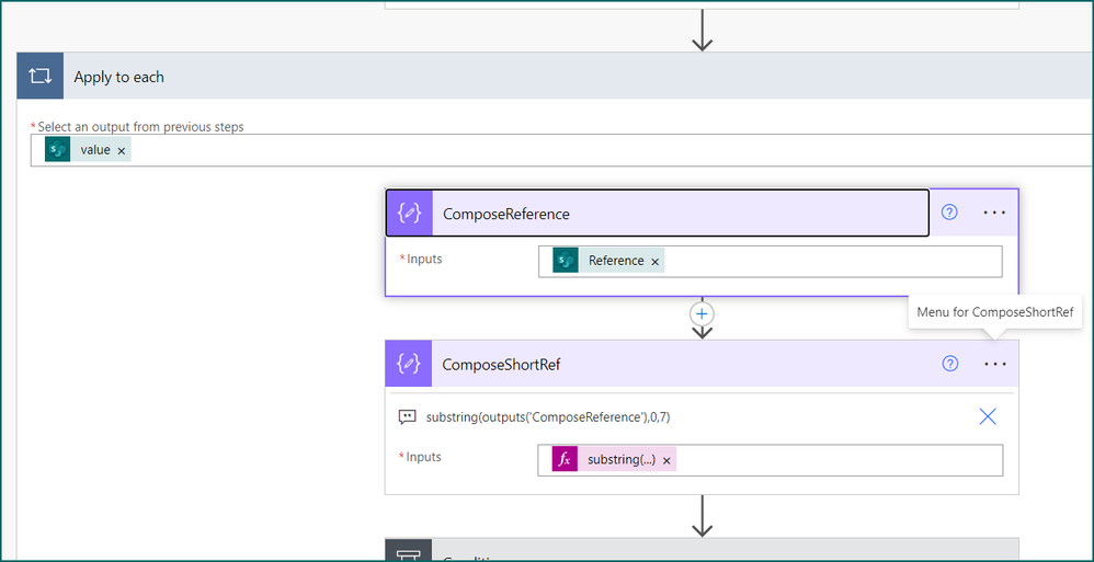 4. Next, add a na apply to each and in the output field select value from the dynamic content box. Next, add a compose action and select Reference from the get items section of the dynamic content box.