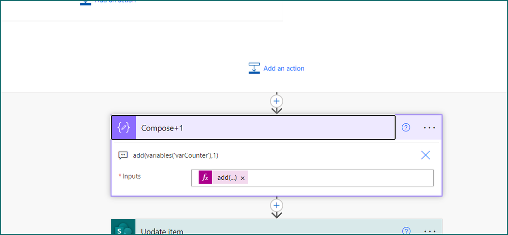 6. Next, outside the apply to each add another compose action and add 1 to the varCounter variable which will give us the next reference number using the expression add(variables('varCounter'),1)
