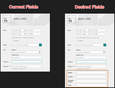 I'm trying to get new fields, Region, Country, Virtual/In-person, and Topic added to the events UI: