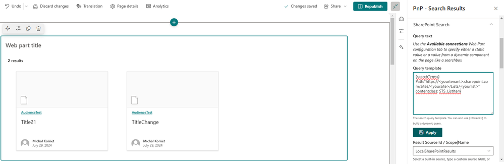 I would like to try if it is possible to display just the content of a sharepoint list in a PnP- SearchResult. Is that possible? I guess i have to put something in the field after keyword {SearchTems} ?