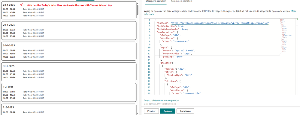 I have a SharePoint list which contains a column DateTime called Datum. How can i sort the list on Today's date. I.o.w: how can i make the row of Today's date on top of the list. Maybe in the JSON-code?