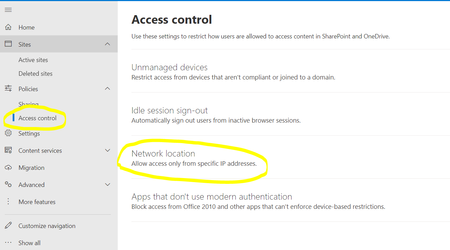Inside SharePoint admin center >> Access control >> we can restrict access to SharePoint & OneDrive to only specific IPs, as follow:- but can we apply same settings to the SharePoi...