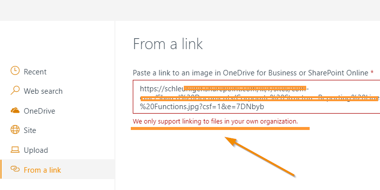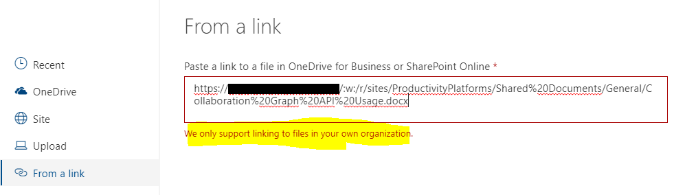 Since few days we got this error message if we try to add a link to a file or document on a sharepoint site: "We only support linking to files in your own organization."