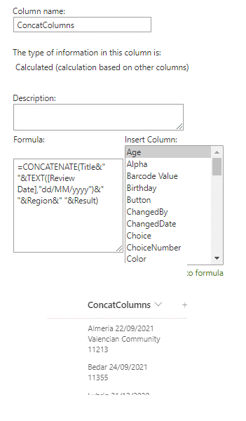 =CONCATENATE(Title&" "&TEXT([Review Date],"dd/MM/yyyy")&" "&Region&" "&Result)