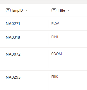Rob_Elliott Somehow, and I don't know how, my boss created a Microsoft List where EmpID was used as the Title of the Microsoft List. That first screen shot is from that Microsoft List. Adjacent to that column was a column where the display name was, somehow, "Title" whilst it did not behave as if it was the actual (hidden name) Title. I know that the EmpID was the proverbial Title of the List because, as the screen shot shows, the contents of the list are bold.