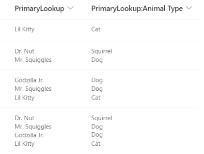 I have an issue with formating a set of Multi-lookup fields with projected fields in my sharepoint list. What I am looking to do is format the PrimaryLookup so that it checks the animal type project...