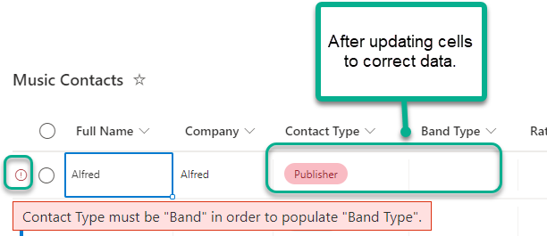 EDIT: I've updated my validation to: =IF([Contact Type]="Band",IF([Band Type]<>"",TRUE,FALSE),TRUE)