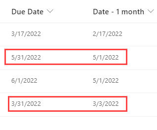 =DATE(YEAR(End),(MONTH(End)-1),DAY(End))If the date created isn't valid, it handles it by adding the number of days that are missing. So it the date falls on the 31st, it won't be a valid date in the previous month. It is off by 1 day and adds a day. For a March 31 due date, in most years, that is off by 3 days (4 in leap year) - and those days will be added.