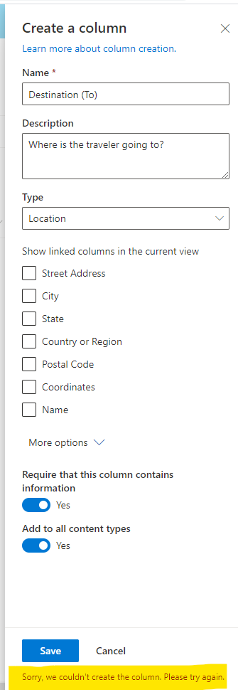 I'm not sure why I'm having an issue with creating a Location column in SPO.