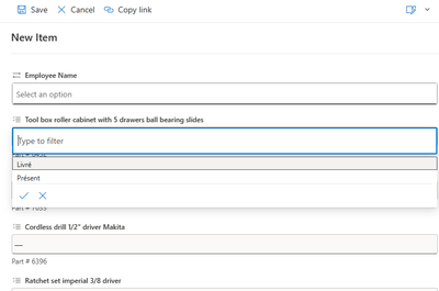 What I am trying to create is a list with a fixed content (the list of tools in the toolbox) that the user can call up and complete the missing information (see screenshot). Part #, Outils, Prix and Classe, should already be present; all the user would need to do is add the serial number, identify if it is delivered (yes/no) and if it is present (yes/no). For the life of me, I just can't figure out how to put this in a list. Any ideas?