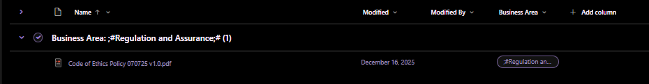 The pic above shows a file that was in a Business Area called Regulation and Assurance - but the file for some reason loses the correct value in the column and pops out in its own 'unknown' business area. To fix it we have to change the column back to the correct value. This happens on a few different libraries that are setup like this.