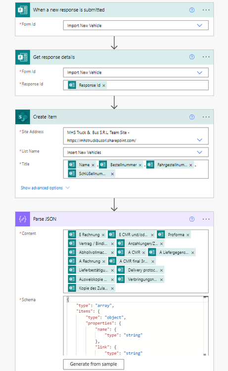 smajic175 your Parse JSON action action is incorrect. In the Content you should just have the form question where you asked the user to upload to upload a file: