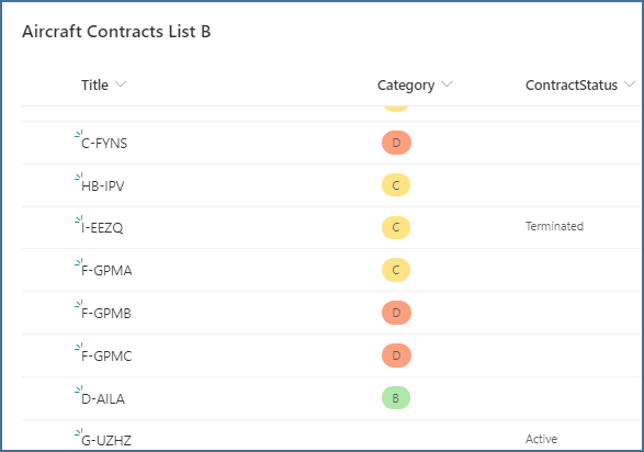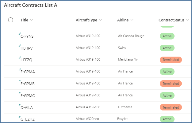 A: a list of aircraft contract based on aircraft name and contract status ( active, terminated a choice field)