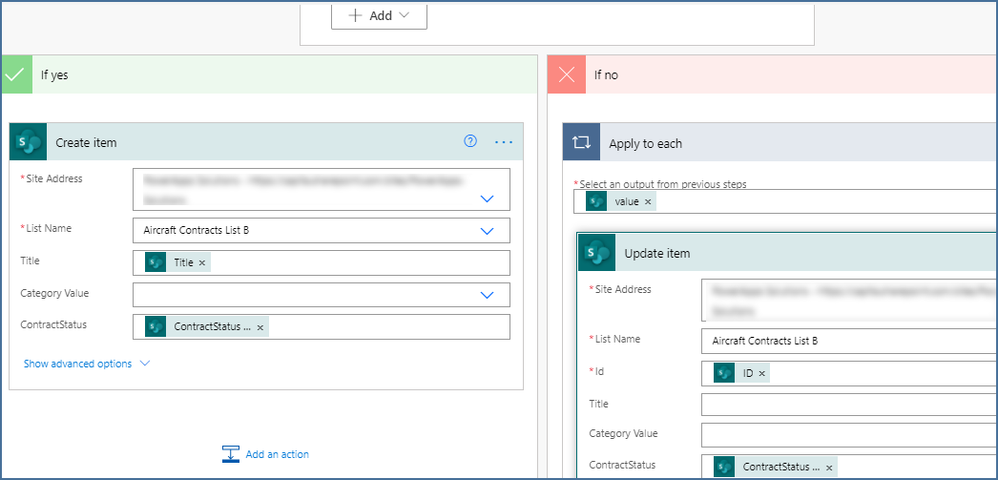 But if there is an equivalent aircraft in List B then we just need to update it with the SharePoint Update item action from the dynamic content. It will wrap itself in an Apply to each (this is expected where you have a Get items action earlier in the flow). In the ContractStatus field you again select Contract Status from the When a new item is created or modified section of the dynamic content.It can take a minute or 2 for the flow to run but it will either add the contract status or update it with no problem. An example of it being updated is in the attached video.