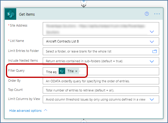 Next, we want to see if that Aircraft is in the maintenance list B, so add a Get items action (note, not Get item) and add a Filter Query. In both lists the aircraft unique registration is in the Title column, so the filter query is Title eq '{select Title from the dynamic content box}' - where the Title you select is from the When a new item is created or modified section of the dynamic content box: