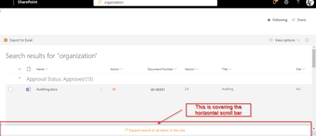 We are having an issue when searching in a document library where the "Expand search to all items in this site" dialog at the bottom of the page is covering the horizontal scroll bar. Makes it hard...
