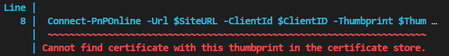 Connect-PnPOnline -Url $SiteURL -ClientId $ClientID -Thumbprint $ThumbPrint -Tenant $Tenant- VasilMichevJul 01, 2024MVPRight, try using the -CertificatePath parameter instead of -Thumbprint (and make sure to also provide the password as needed).