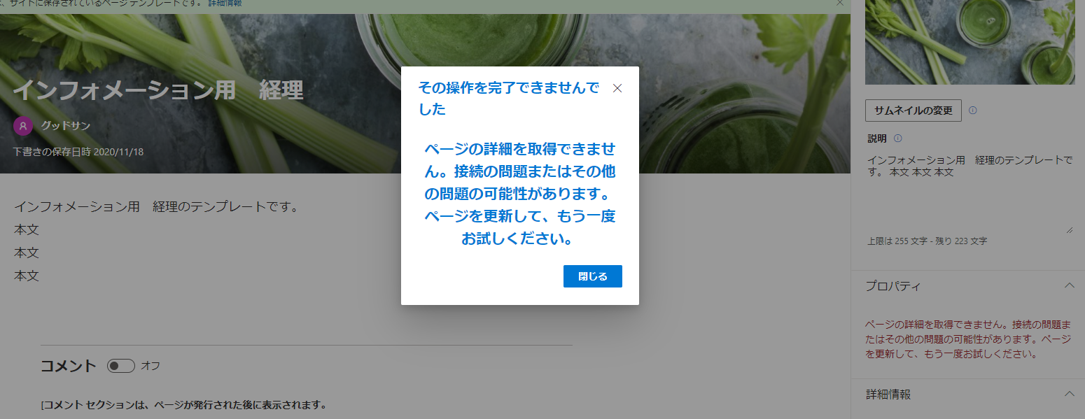 When creating a page template, selecting a property results in the following error: