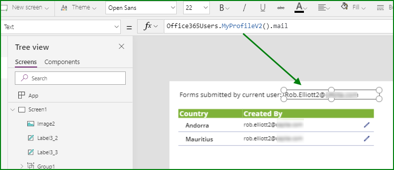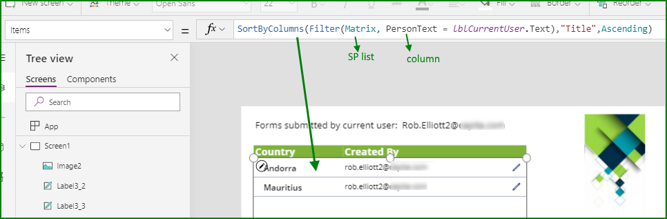 The Power Apps app has a gallery that shows only the items where the current user's email is equal to a text column in the list containing the email address. We don't use the Created By or Modified By columns in this case because the person who is dealing with an item might change, so we just have a text column to hold the email address.