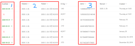 Hi, Everyone Stay safe. I am using SharePoint Online lists. 1. The 'DueDate' column is manually typed in date&time format. 2. The columns 'TODAY2' and 'TODAY' are automatically genera...