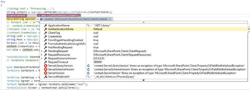 We have a .NET code to create a tag on SharePoint but it is not creating when I tried to debug the code We are getting an error "ServerLibraryVersion = 'context.ServerLibraryVersion' threw an exception of type "Microsoft.SharePoint.Client.PropertyOrFieldNotInitializedException'". We also have an application which copies files to SharePoint. When tried the SharePoint code in that also there also we are getting the same error. Is it problem with SharePoint site or with the code. How to resolve this exception?