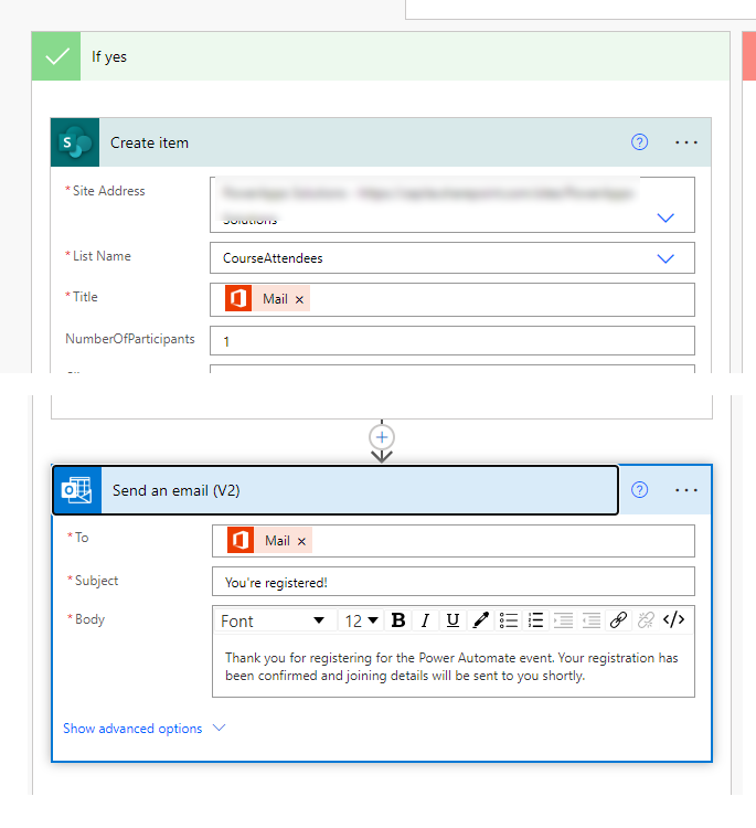 In the green if yes channel add a create item action to add a new iten into the list. Then add a Send an email (v2) action or a send an email from a shared mailbox action and add the "you're registered" text.