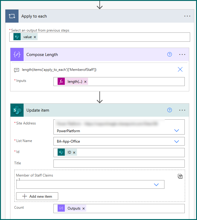 The Compose action has the expression length(items('apply_to_each')['MemberofStaff']