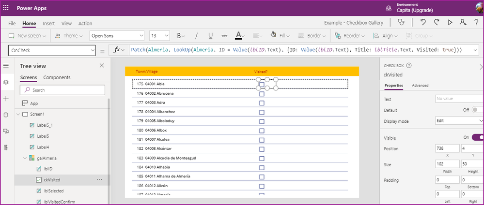 Patch(Almeria, LookUp(Almeria, ID = Value(lblID.Text), {ID: Value(lblID.Text), Title: lblTitle.Text, Visited: true}))On Uncheck: