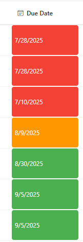 { "$schema": "https://developer.microsoft.com/json-schemas/sp/v2/column-formatting.schema.json", "elmType": "div", "style": { "background-color": "=if(@currentField < @now, '#f44336', if((Number(@currentField) - Number(@now)) <= 2592000000, '#ff9800', '#4caf50'))", "color": "white", "padding": "6px", "border-radius": "4px", "text-align": "center" }, "children": [ { "elmType": "span", "txtContent": "=toLocaleDateString(@currentField)" } ] }--------------------------------------------