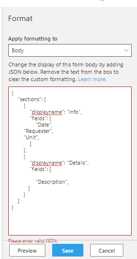 hi There a new format to change the view of the SP list into form like. I try to change it but is state that the JSON is not right as I followed the instruction as per the Configure list from MS?...