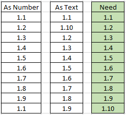 HomerJSimpson this has always been an issue with SharePoint. If you don't want the number column to be in the format 1.01, 1.02....1.10, 1.11 etc then the only real workaround is to have 1 column for the whole number and another column for just the decimals. Then add a calculated column where you concatenate the other 2 columns with a decimal point in the middle as in =Whole&"."&Decimals. Go to list settings and sort the view by Whole then Decimals.