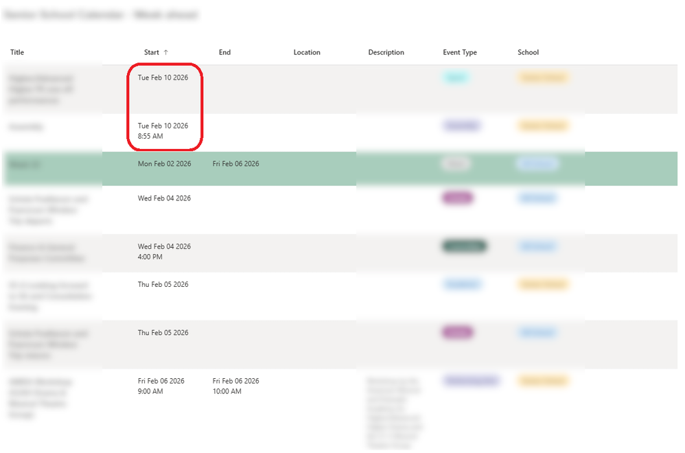 - The events 7 days in the future do appear but they are sorted incorrectly, appearing at the TOP when the date sort order should show them at the BOTTOM.