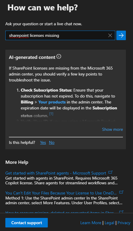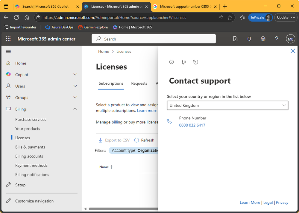 Thanks Rob, but as my screenshot of the Admin Center shows, I am only given a single option for contacting support, that being a non-existent telephone number. Whilst my screenshot shows me having approached via Licensing, I get the same if I go direct via Support in the LH menu.