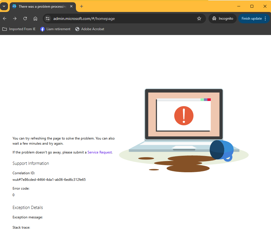 Actually it's just gotten worse - I can no longer get into the Admin Center with this account. After entering my credentials, it gives the following: