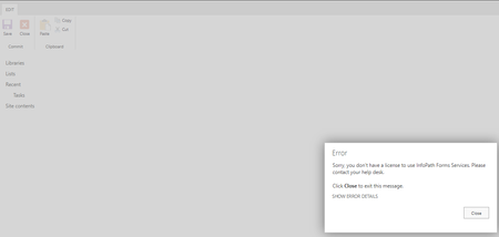 The error message suggests that your user does not have an Infopath license.